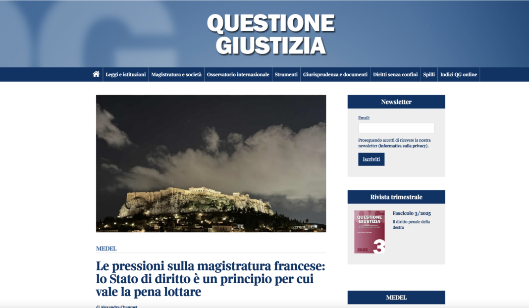 Questione Giustizia online published Alexandra Chaumet’s written speech “Pressure on the French judiciary: the rule of law is a principle worth fighting for” at the MEDEL international conference The backsliding of the Rule of law and the pressure exerted on the Judiciary in Europe. The role of the European Union (Athens, 21 november 2025).